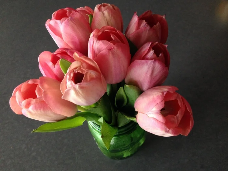 Celebrate Simplicity: I often grab the nearest vessel to hold flowers in my home - especially plain, colorful blossoms from the corner deli. Coffee mugs, soda glasses, and canning jars all match the simple quality and elegance of unadorned flowers. I have a small collection of vintage blue Ball jars I like to use as a contrast to my modern kitchen. But I just stumbled on these vibrant green jars at Fishs Eddy and I couldn't wait to fill them with a handful of pink tulips.