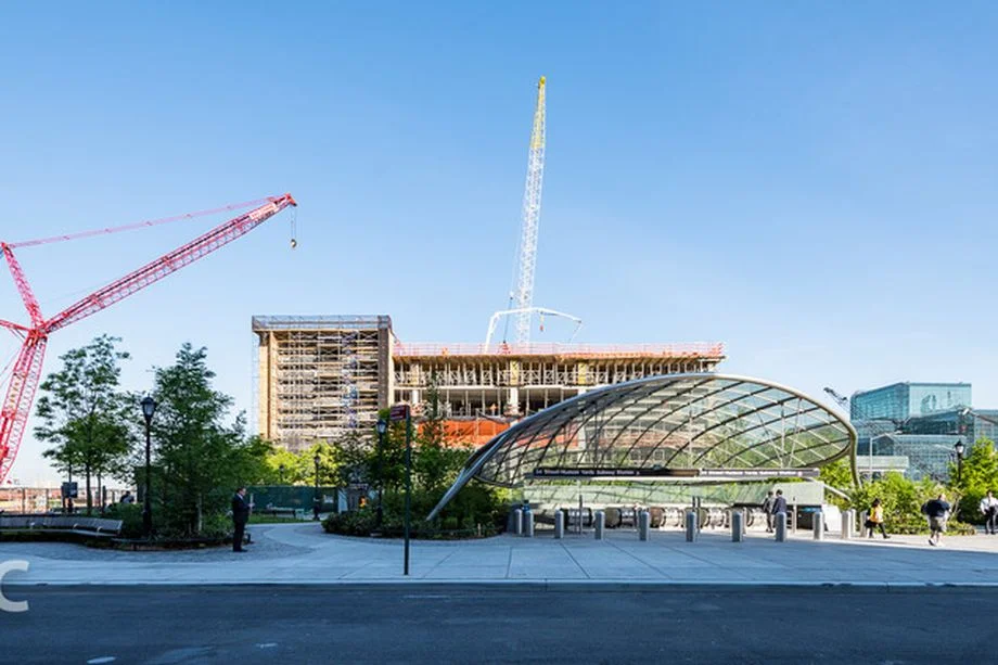 The new 7-train subway extension with 55 Hudson Yards under construction in the background, via CurbedNY
